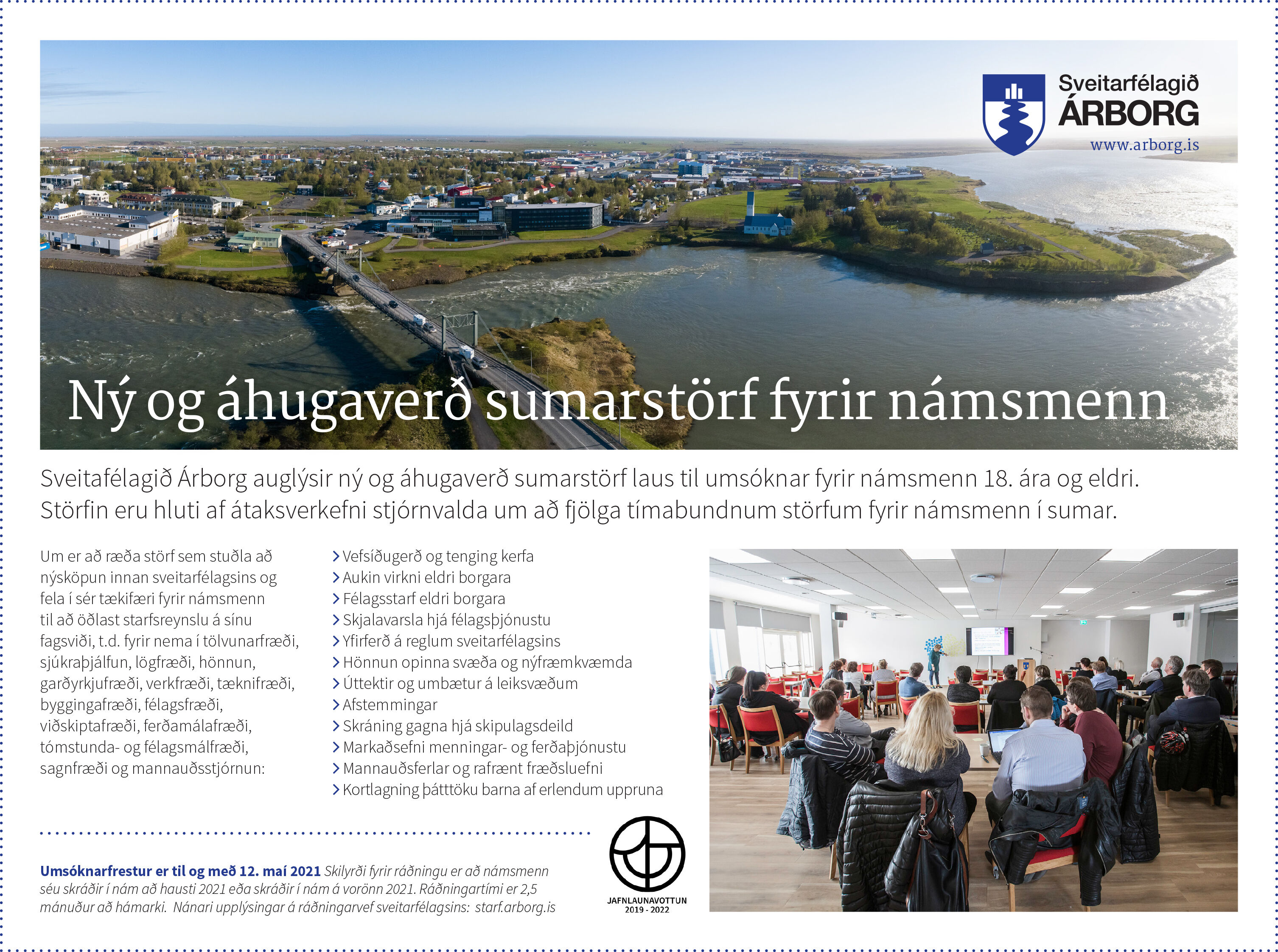 Skilyrði fyrir ráðningu er að námsmenn séu skráðir í nám að hausti 2021 eða skráðir í nám á vorönn 2021. Ráðningartími er 2,5 mánuður að hámarki. Umsóknarfrestur er til og með 12. maí n.k.