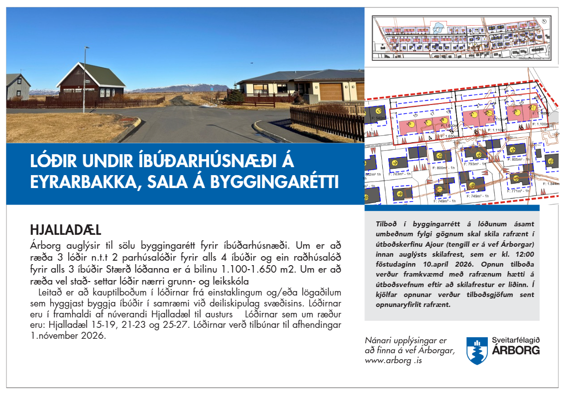 Leitað er að kauptilboðum í lóðirnar frá einstaklingum og/eða lögaðilum sem hyggjast byggja íbúðir í samræmi við deiliskipulag svæðisins. Lóðirnar eru í framhaldi af núverandi Hjalladæl til austurs Lóðirnar sem um ræður eru: Hjalladæl 15 - 19, 21 - 23 og 25 - 27. Lóðirnar verða tilbúnar til afhendingar 1.nóvember 2026.